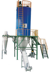 潔凈空氣加熱后進入干燥塔,在塔內熱風中用二流體(或三流體)噴嘴將各種料液物化成微小液
