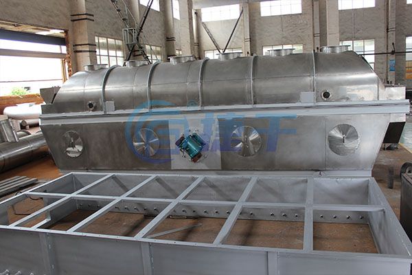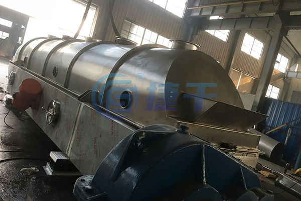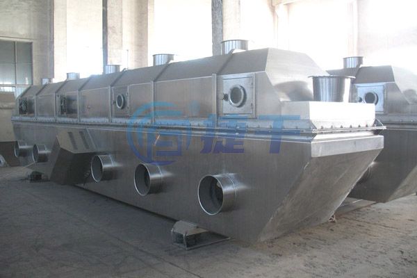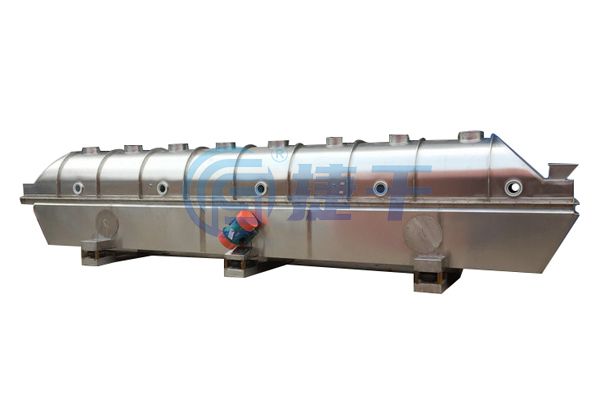 物料自進料口進入機內,在振動力作用下,物料沿水平流化床拋擲,向前連續運動,熱風向上穿過流化床同濕物料換熱后,濕空氣經旋風分離器除塵后由排風口排出,干燥物料由排料口排出。