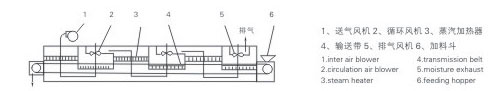 該機(jī)是穿流連續(xù)式干燥設(shè)備,用于透氣性較好的片狀、條狀、顆粒狀物料的干燥