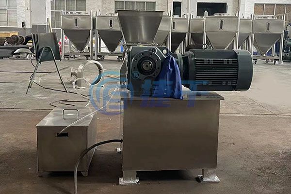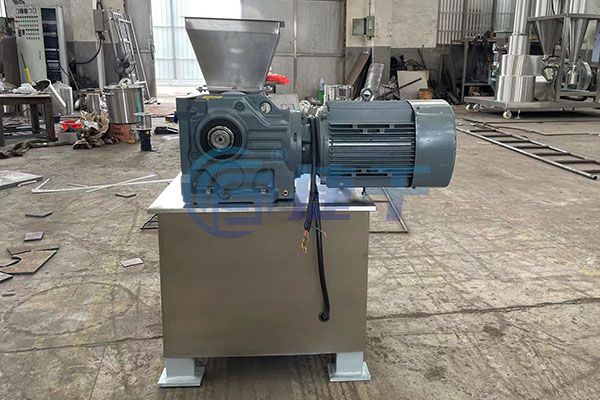 經混合、捏合的濕物料或低軟化點(一般指小于60℃)物料,在螺桿輸送過程所產生的擠壓力作用下,被從機頭模板開孔處擠出,形成條狀;再經過干燥或冷卻得到短柱狀顆粒成品,從而實現將粉狀產品改變為均勻的顆粒產品的目的。自然斷裂長度取決于物料粘結強度,一般為直徑的1.25-2.0倍范圍內。對長度有特殊要求的前擠出型可采用外切粒的方式,這樣可以得到相對均勻的顆粒成品。