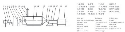 燃料通過燃燒器燃燒,產生高溫燃氣。并借助具有強化換熱措施的熱風爐將高溫燃氣的熱量傳導給被加熱的空氣,高溫燃氣經熱量散發后溫度降低至250℃后排到大氣中。需加熱的空氣通過選配的鼓風機強送入熱風爐,吸熱后溫度升至額定值從熱風出口處送出,當熱風溫度達到額定溫度上限時,燃燒器會自動停止燃燒或自動轉為小火焰燃燒,當熱風溫度降低到額定下限溫度時,燃燒器又會重新點燃運行或轉為大火燃燒,升溫的速度可以調節進風閥的開度來實現。