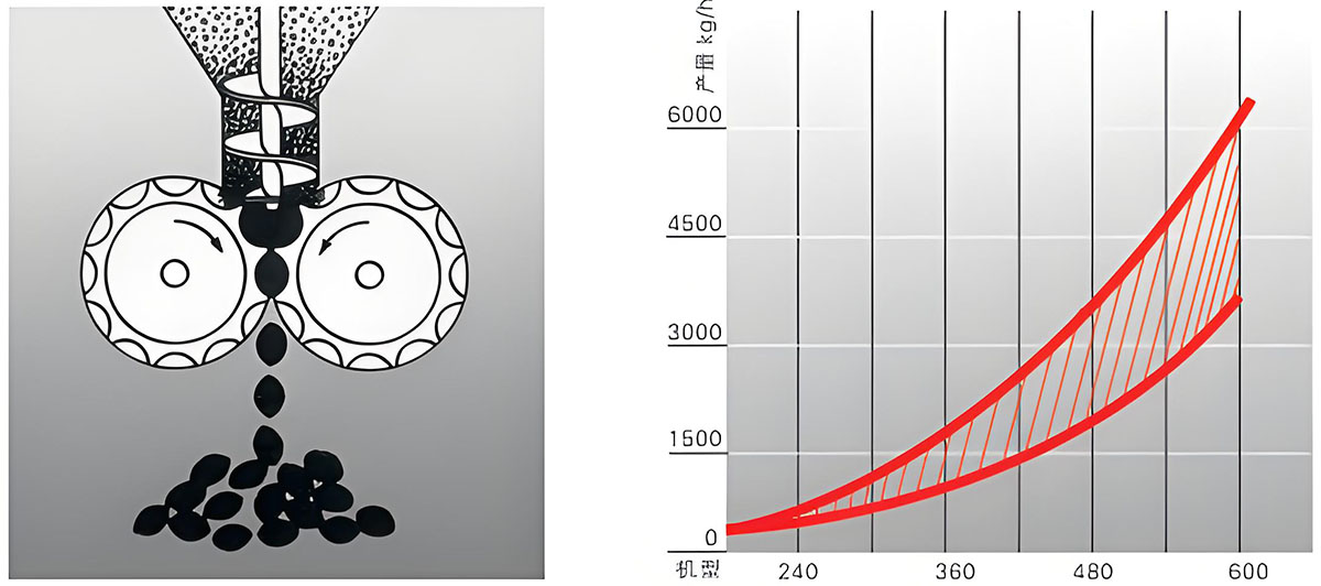 粉狀物料由振動給料斗經橫向螺旋送料器定量,均勻地加人軋片主料斗,使軋片主料斗內保持恒定的料粒,然后由軋片主料內的縱向錐螺旋對粉料進行預壓縮并輸送到兩只壓輥的弧形槽口,兩只壓輥表面均勻分布形狀相同的半扁圓形弧槽或菱形槽,通過一對齒輪的嚙合傳動,使兩只壓輥等速,反向旋轉,將錐螺旋輸送至槽口的物料咬入槽內并瞬間強制壓縮,物料經過壓縮后隨著壓力逐漸減小在其彈力及重力作用下,從槽內脫落,進入破碎整粒系統,然后根據用戶的粒度要求過篩、分級,獲得符合質量要求的均勻顆粒狀產品,篩下粉重新返回振動料斗循環利用。