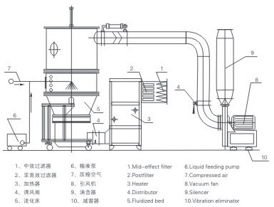 物料粉末粒子,在原料容器(流化床)中呈環(huán)形流化狀態(tài),受到經(jīng)過(guò)凈化后的加熱空氣預(yù)熱和混合,將粘合劑溶液霧化噴入,使若干粒子聚集成含有粘合劑的團(tuán)粒,由于熱空氣對(duì)物料的不斷干燥,使團(tuán)粒中水分蒸發(fā),粘合劑凝固,此過(guò)程不斷重復(fù)進(jìn)行,形成理想的、均勻的多微孔球狀顆粒。