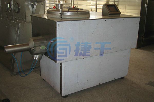 粉體物料與粘合劑在圓筒形容器中由底部混合漿充分混合成濕潤軟材,然后由側置的高速粉碎槳切割成均勻的濕顆粒。
